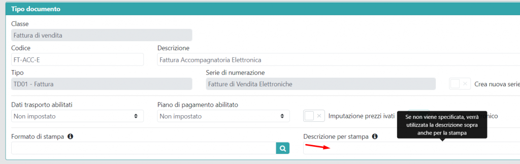 1. Aggiunto sul tipo documento la “Descrizione per stampa“. Ora è possibile personalizzare il testo che verrà utilizzato in Stampa in sostituzione della descrizione: