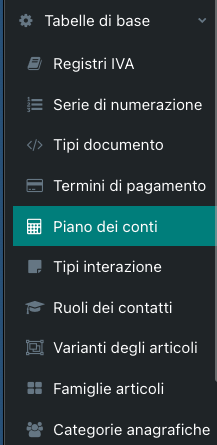 Per personalizzare il tuo piano dei conti e renderlo perfetto per seguire la tua attivitĂ seleziona la voce Tabelle di base dalla barra laterale e seleziona la voce Piano dei conti dal menĂą che apparirĂ sotto.