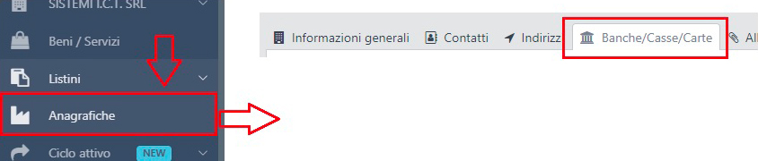 Se invece vuoi agire sulle anagrafiche dei tuoi clienti o fornitori, seleziona la voce Anagrafiche dalla barra laterale sinistra e posizionati sulla tab banche/casse/carte della schermata.