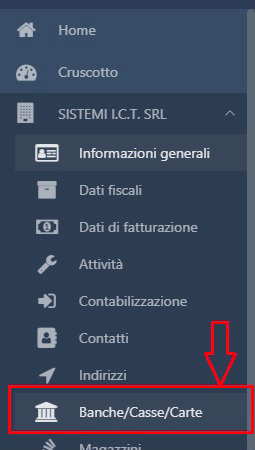 Dal menù laterale seleziona La Tua azienda scegli la voce ➡️banche/casse/carte dal menù che si apre.