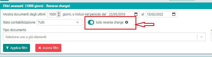 Da oggi non avrai più problemi ad individuare le fatture con Reverse Charge tra le tue fatture di acquisto: è stato aggiunto un filtro che consente di visualizzare, tra le fatture ricevute, solo quelle soggette a Reverse charge e per le quali è possibile effettuare l’integrazione.