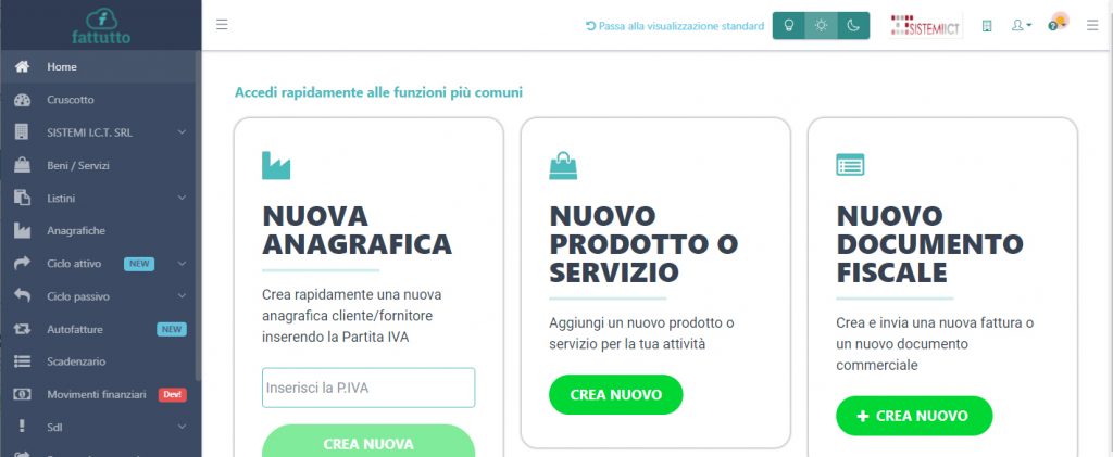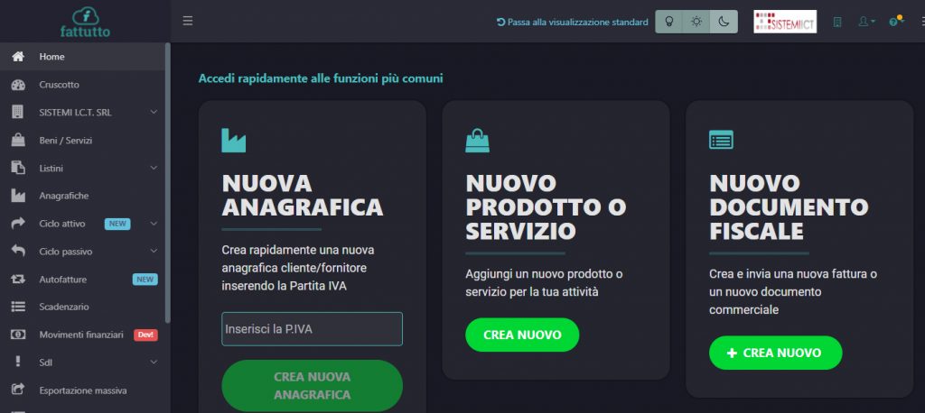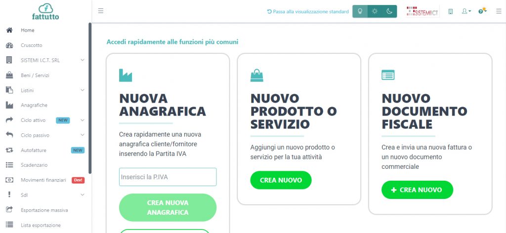 La nuova versione di Fattutto, ti offre anche la possibilità di personalizzare la modalità di visualizzazione scegliendo tra tre diverse colorazioni: puoi selezionare la modalità che preferisci utilizzando i pulsanti che trovi nella barra in alto e scegliere tra modalità chiara, scura o standard (uguale all’attuale impostazione).