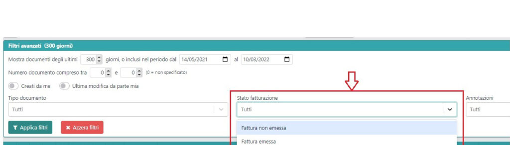 Puoi decidere di visualizzare solo i documenti già fatturati utilizzando i filtri avanzati e scegliendo tra le opzioni “Fattura emessa” e “Fattura non emessa”.
