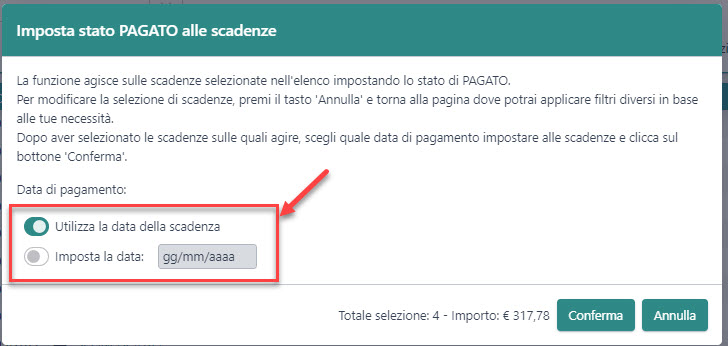 2️⃣ Imposta la data: consente di inserire una data di pagamento specifica che verrà attribuita a tutte le scadenze selezionate.