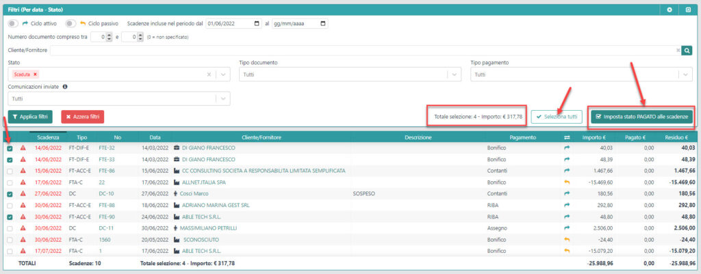 ➡️Applica i filtri necessari per ottenere l’elenco delle scadenze desiderato e successivamente seleziona le scadenze per le quali impostare lo stato di PAGATO.
