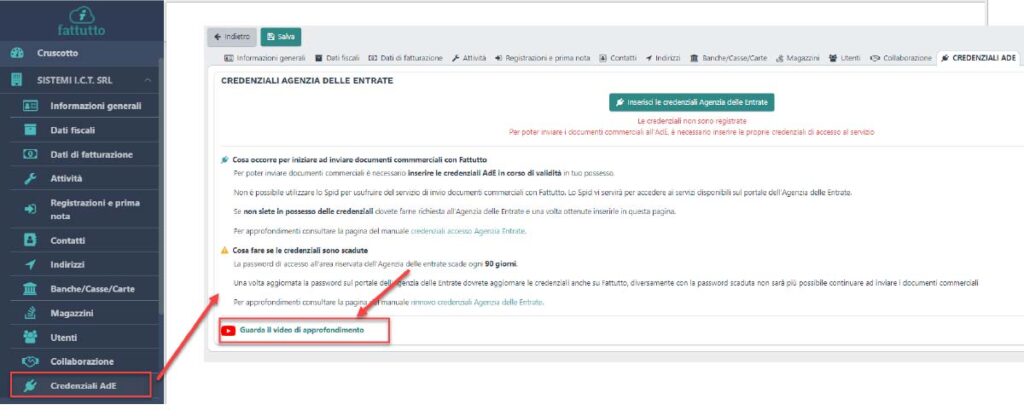 Il video è disponibile sul nostro canale You Tube ed è facilmente raggiungibile da Fattutto dalla pagina Credenziali Ade nei dati della tua azienda.