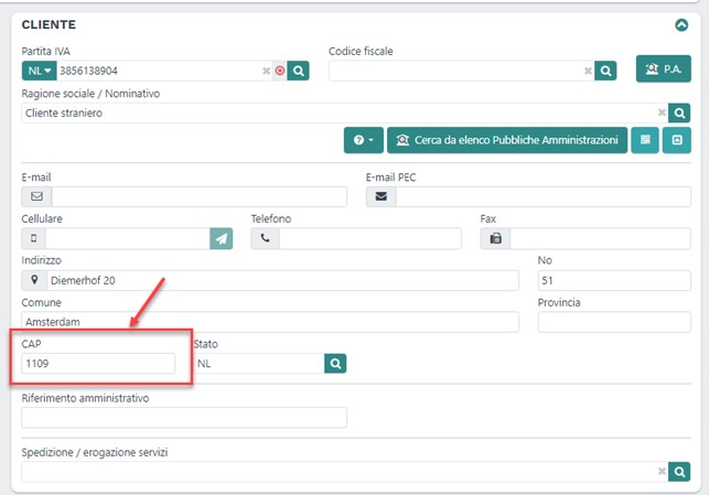 Nel caso di cliente con Partita Iva estera potrai indicare nei dati di residenza il CAP corretto, anche se composto da un numero di caratteri diverso da 5.