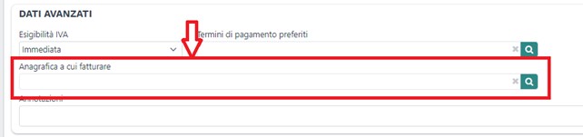 All’interno delle informazioni generali, scorri fino al riquadro Dati avanzati e posizionati sulla riga Anagrafica a cui fatturare.
