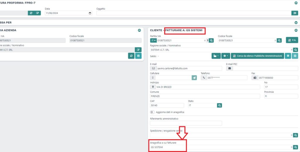 Quando andrai a creare un preventivo, un ddt, una proforma o un ordine di lavoro per questo cliente automaticamente il sistema imposterà l’anagrafica a cui fatturare scelta anche nei dati del cliente sul documento.