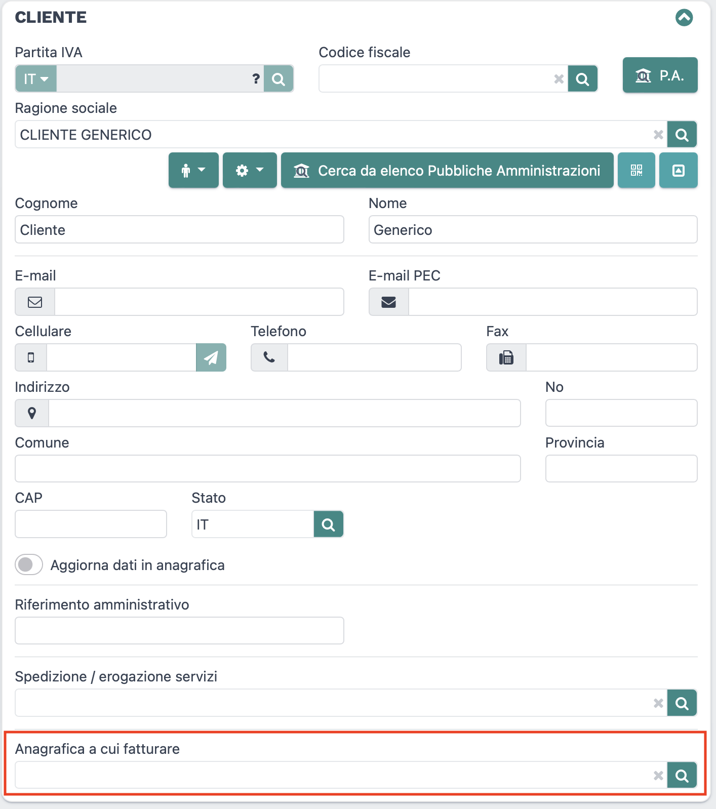- dal documento di origine, nei dati relativi al cliente, nei casi in cui la fatturazione ad altro cliente sia estemporanea.