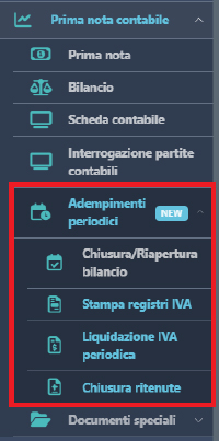 Trovi la gestione alla voce Liquidazione IVA periodica nel menu Prima nota contabile – Adempimenti periodici.