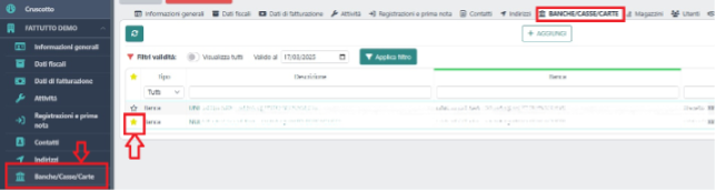 Dalla colonna di sinistra all’interno del menù “dati della tua attività”, seleziona la pagina Banche/Casse/carte