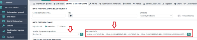 L’impostazione della banca preferita è un’operazione che puoi eseguire anche dalla pagina Dati fatturazione, insieme alla scelta del tuo termine di pagamento preferito.