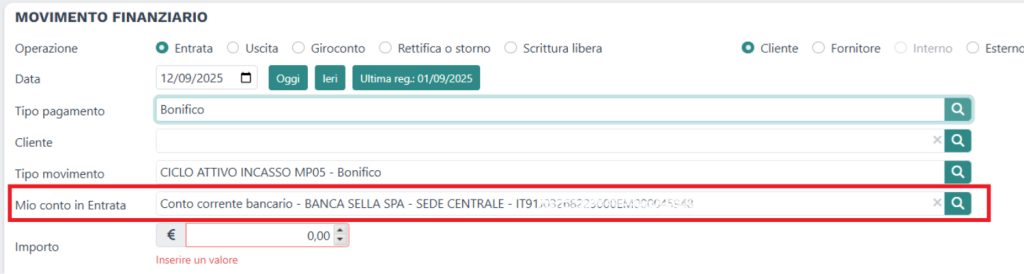 In questo esempio il campo Mio conto in Entrata è stato valorizzato automaticamente in base al Tipo pagamento scelto (Bonifico) con la banca preferita.