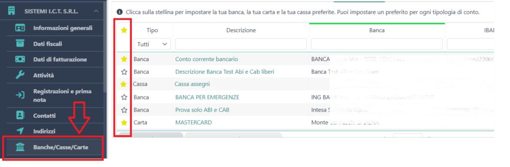 - Seleziona la voce Banche/Casse/carte dal menu di sinistra nei dati della tua attività