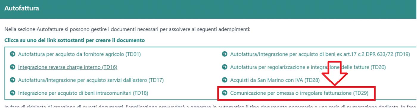 Clicca sul bottone in alto +Documento > Autofattura e seleziona l’opzione Comunicazione per omessa o irregolare fatturazione (TD29)