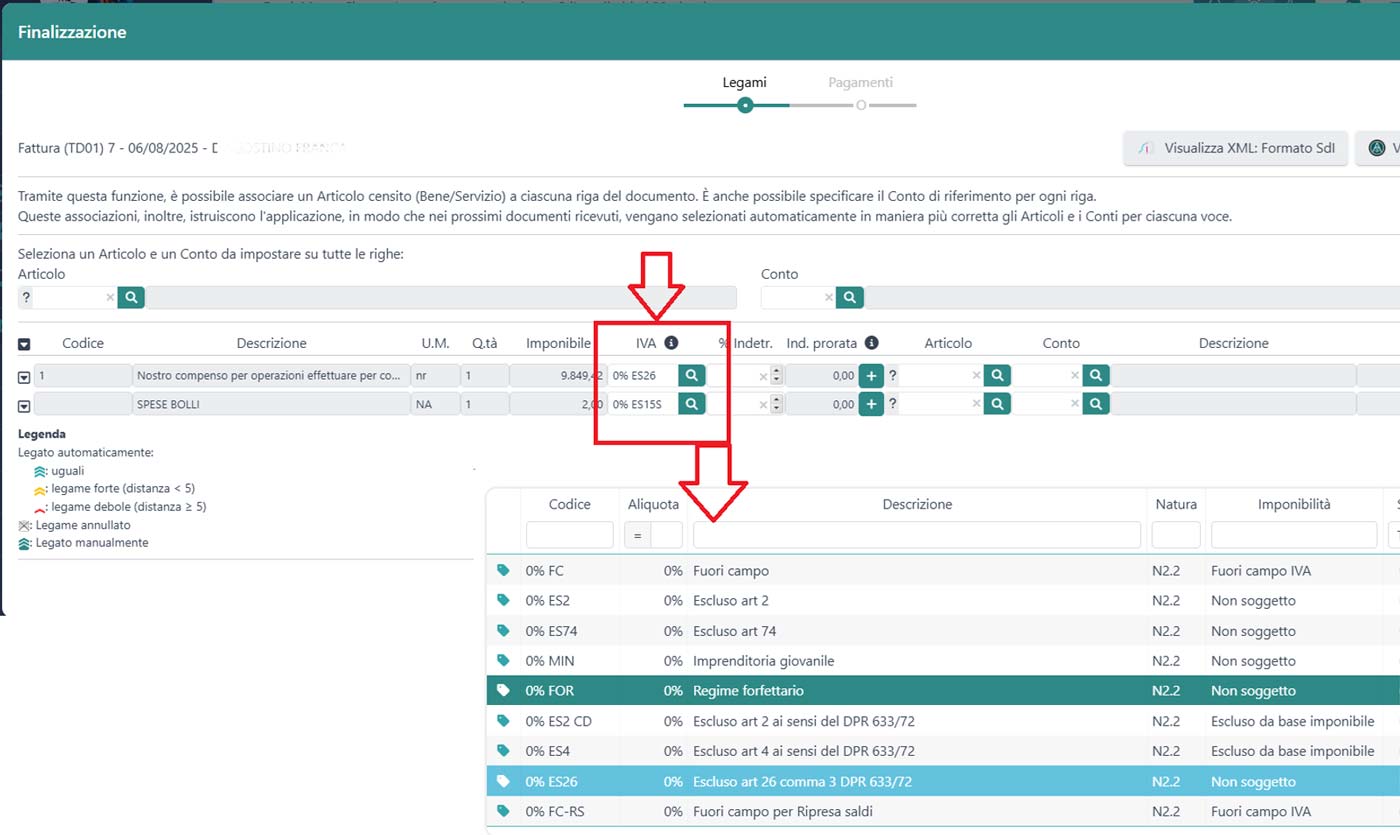 Clicca sulla lente e scegli tra i codici IVA disponibili, proposti in base alla stessa aliquota/natura IVA rilevata nel file XML originale della fattura.