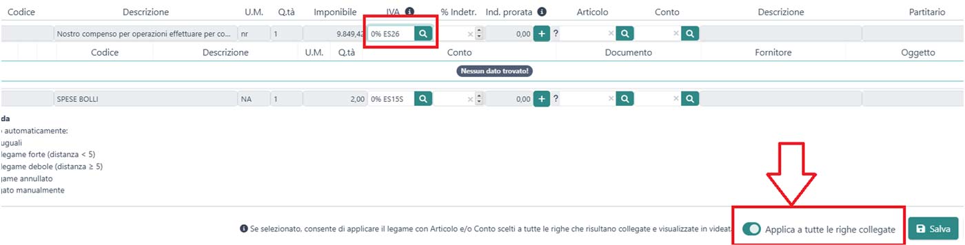 Modifica il codice IVA e accendi il flag “Applica a tutte le righe collegate”