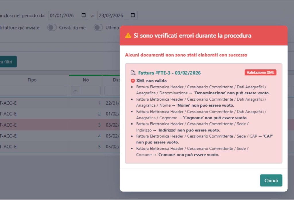 Abbiamo migliorato la funzione al fine di ricevere un resoconto dei documenti che sono andati in errore, evidenziandoli e dettagliando per ciascuno i motivi di errore.