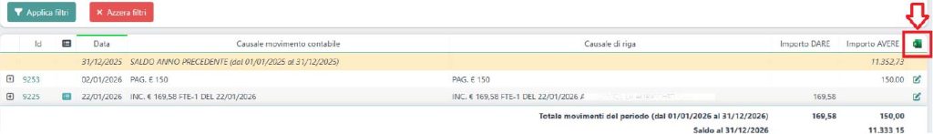 Dopo aver consultato la scheda, è possibile esportare l’elenco completo dei movimenti in formato Excel con un semplice clic.